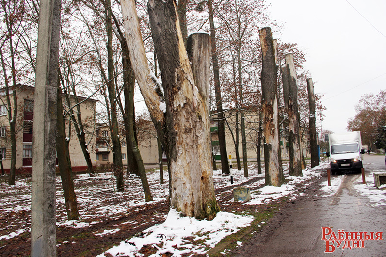 Каментуюць спецыялісты. Сяргей Гук, намеснік старшыні райвыканкама, і Сяргей Бабрук, дырэктар КУВП «Камунальнік». Наконт сухіх дрэў, то ў 2023 годзе сухастой плануецца ўбраць, на яго месца высадзяць новыя маладыя дрэўцы.