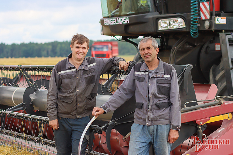 3. Жыць на працы ў жніво няпроста, але пачэсна. Таму і працуюць «да сёмага поту» камбайнер Аляксандр Дайнэка і старшы камбайнер Аляксандр Слабада.