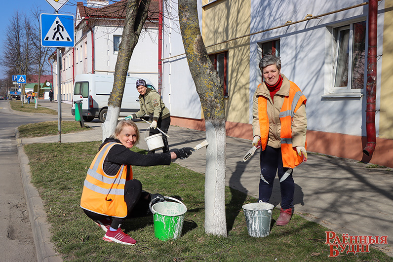 Круглы год праводзяцца работы па добраўпарадкаванні. А веснавы сезон пачынаецца з пабелкі дрэваў, якую выконваюць Ірына Цабрук, Марына Кацюруба і Наталля Постнік.