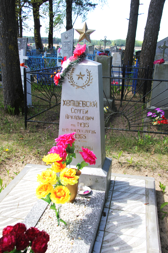 На здымках: Сяргей Аркадзьевіч Хвашчэўскі (злева) — перадваеннае фота. Сустрэча каўпакаўцаў у 1961 годзе: С.А.Хвашчэўскі першы злева, крайні справа — легендарны партызанскі генерал С.А. Каўпак. Дом у в.Лінова, дзе жыў Хвашчэўскі. Сціплы помнік на Аранчыцкіх могілках.