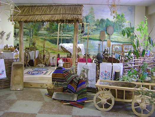 Тым не менш, тут ёсць што паказаць і чым здзівіць гасцей. Ужо на ўваходзе сустракае прыгожая кампазіцыя “Беларускі падворак”. Чаго тут толькі няма! І тканыя ручнікі, і плот з лазы, і нават воз, на якім, як і мае быць, месціцца мех (мабыць, поўны жыта). А калі зазірнуць далей, то ўбачым калыску, якія раней былі амаль у кожнай беларускай хаце. Пройдзем далей – і сустрэнем сапраўднага дамавіка, які, як кажуць тут, ахоўвае не толькі гэтую ўстанову, але і тых, хто калі-небудзь завітваў сюды. А завітаць сапраўды варта.