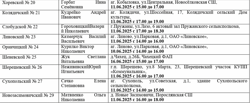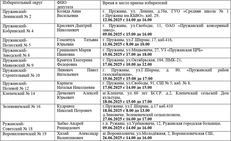 График личного приема граждан, их представителей и представителей юридических лиц депутатами Пружанского районного Совета депутатов 29 созыва на июнь 2025 год.