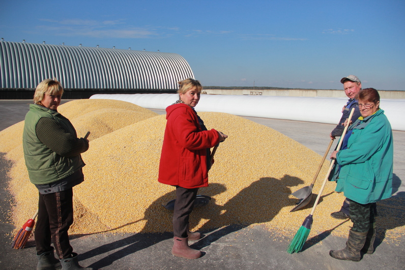 Бункер камбайна «GS 12А1 PRO» поўны — тут ўжо напагатове «МАЗ». Зерне кукурузы адразу дастаўляецца на «ЗСК-20», дзе частка ідзе на сушку. Пасля чаго закладваецца на захоўванне ў складзе з наступным выкарыстаннем у якасці дабаўкі ў камбікорм.