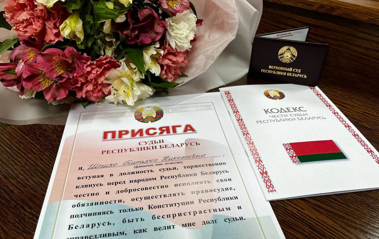 «Вступая в должность судьи, торжественно клянусь перед народом Республики Беларусь честно и добросовестно исполнять свои обязанности, осуществлять правосудие, подчиняясь только Конституции Республики Беларусь, быть беспристрастным и справедливым, как велит мне долг судьи», — говорится в тексте присяги.