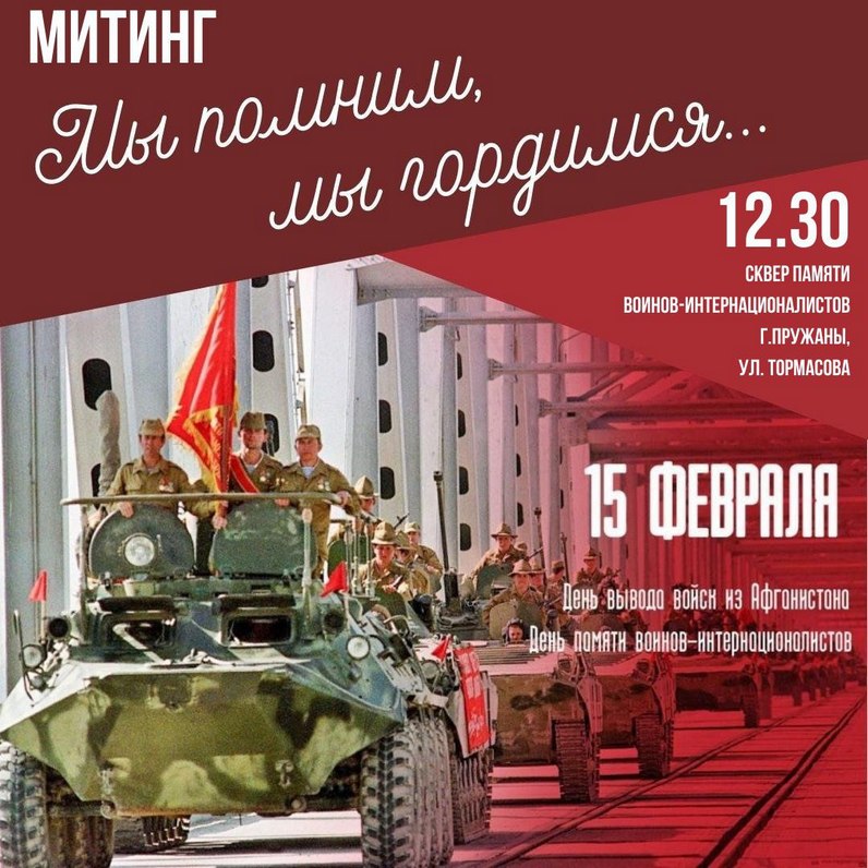 12.30 — Мітынг, прысвечаны вываду савецкіх войскаў з Афганістана (сквер памяці воінаў-інтэрнацыяналістаў, вул. Тармасава).