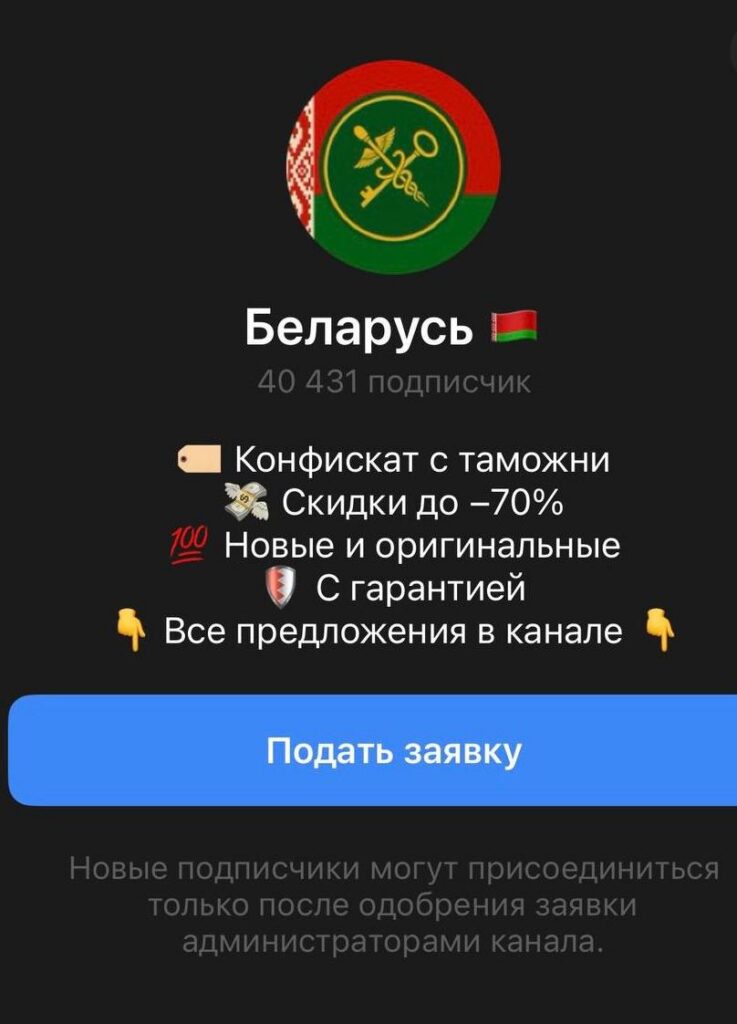 При этом у канала более 40 тысяч подписчиков. Для большей убедительности мошенники оформляют страницы с использованием символики белорусской таможни.
