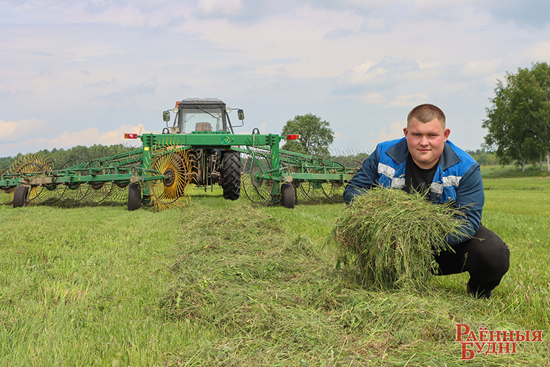 Побач зграбаў сянажную масу ў валкі малады механізатар Аляксей Патапчук. Ніхто і не гаворыць, што маладосць — гэта загана, наадварот, вельмі прыемна, што не цураюцца хлопцы і дзяўчаты сельскай гаспадаркі, не баяцца запэцкаць рукі. А калі яшчэ працуеш побач з такім чалавекам, як Васіль Яроцкі, то і вопыту набярэшся, і на жывым прыкладзе пабачыш, што праца на зямлі — самая што ні на ёсць паважаная, ад якой таксама можна атрымліваць асалоду.