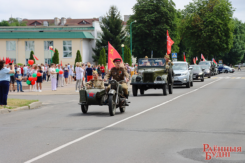 Затым адбыўся невялікі аўтапрабег, які адкрывала старая тэхніка, у рады якой уліліся сучасныя аўто з дзяржаўнымі сцягамі.