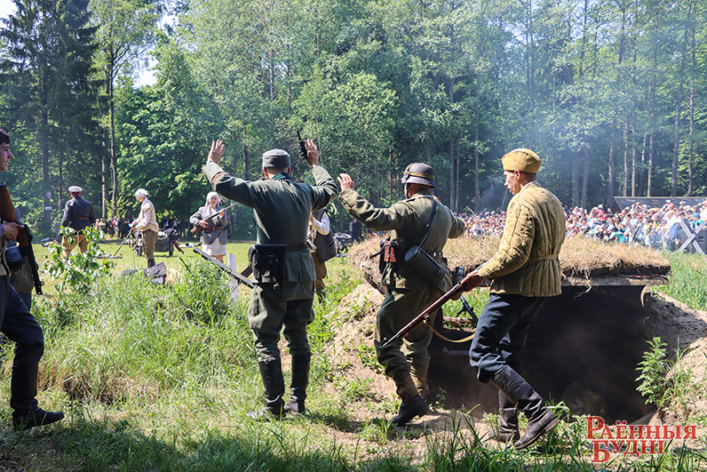 Прызнаюся, што мне ўпершыню давялося быць відавочцам падобнага дзейства. Выбухі, дым, стрэлы адступаючых «фрыцаў», крыкі «Ура! Мы перамаглі!», узятыя ў палон ворагі, якіх па-майстэрску сыгралі ўдзельнікі клубаў… Усё было даволі рэалістычным.