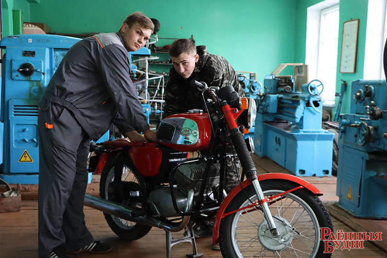 Калі карэспандэнты завіталі ў майстэрні аграрна-тэхнічнага каледжа, там праходзілі чарговыя заняткі аб’яднання па інтарэсах «Майстэрня тэхнічнага канструявання». Як паведаміў кіраўнік аб’яднання выкладчык вучэбнага прадмета «Устройства і эксплуатацыя аўтамабіляў» Дзяніс Вашкевіч, хлопцы займаюцца аднаўленнем старой тэхнікі, рамантуюць матацыклы, веласіпеды.