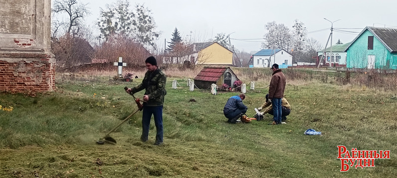 На мінулым тыдні працоўны дэсант шчыраваў і на добраўпарадкаванні тэрыторыі помніка архітэктуры XVIII стагоддзя — Троіцкага касцёла ў аграгарадке Лыскава. Задача стаяла — ачысціць тэрыторыю ад дзікарослага кустоўя.